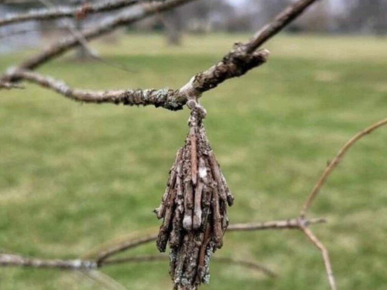 - Présence de sacs : Ces sacs ressemblent à des cônes bruns suspendus aux branches. Ils mesurent environ 5 cm de long et sont souvent visibles tout au long de l’année.